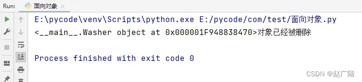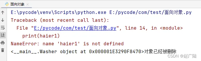 class Washer(): def __init__(self, width, height): self.width = width self.height = height def __del__(self): print(f'{self}对象已经被删除') haier1 = Washer(10, 20) # <__main__.Washer object at 0x0000026118223278>对象已经被删除 del haier1