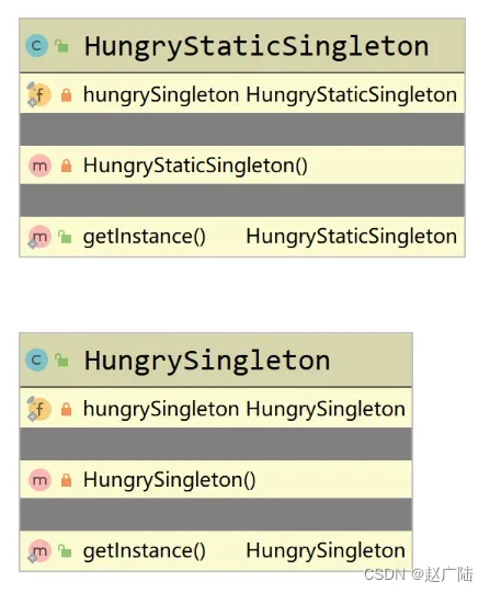 //饿汉式静态块单例模式 public class HungryStaticSingleton { //先静态后动态 //先上,后下 //先属性后方法 private static final HungryStaticSingleton hungrySingleton; static { hungrySingleton = new HungryStaticSingleton(); } private HungryStaticSingleton(){} public static HungryStaticSingleton getInstance(){ return hungrySingleton; } }