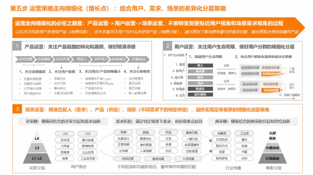 第四步只是完成了运营策略的搭建,也许只能保障我们60分发挥,即大运营方向上符合商业逻辑和目标发展。但要实现业务的高增长,下一步一定是继续走向精细化,就是适配到不同用户群体、不同阶段需求、不同使用场景——更加精细化和差异化的运营策略。运营走向精细化的必经之路是:产品运营->用户运营->场景运营,以往我们更多关注的是产品本身的运营,关注数据转化即可。随着业务瓶颈的进一步凸显,我们会发现运营的对标主体并不是产品,而是用户,毕竟产品不会自己创造价值,只有用户使用后才会产生价值,于是我们开始关注用户真实的需求和用户的满意度(NPS、转漏损)。最终一定会转变到更加贴近用户视角和场景需求适配的过程,也就是场景运营(更加关注用户在这个特定场景下的需求满足和使用顺滑)1.产品运营阶段:关注产品链路的转化和漏损,做好产品的顺滑承接。根据用户在产品中的数据指标,关注核心转化,尝试不断降低不合理的跳失和漏损。这个阶段的优点是在单链路下可以发挥出极致效果,但太过于局部,无法作用于产品整体的体验评价(单个环节都很顺滑并不代表用户体验好,如下单要跳转10次,每次转化率都是99%,单环节效果不错,但最终在用户视角是很差的)2.用户运营阶段:回归到用户的整体视角上,关注用户生命周期,做好用户分群的精细化分层。①回归到用户整体视角上的好处是,以往关注的更多是单环节的耗损,以用户视角出发我们能更好的还原出用户所面对的产品整体(比如用户下单需跳转10次,用户视角将帮我们更好的发现用户所面对的产品整体体验);②建立用户在产品中的生命周期,这样做的好处是可以对当前用户群体做一个通用的层次区分,便于做一些简单的差异化运营(如在活跃用户内按照支付笔数,区分高活跃、中活跃、低活跃用户;或在低活跃用户中按照RFM,区分高价值、中价值、低价值用户),这个方法比前者要更加精细化,但还是没法精准的刻画同一分层用户的差异需求(如高活跃用户里,淘卖、跨境用户是有不同的下单行为和需求的)3.场景运营阶段:精准匹配人、产品、场景,最终实现足够差异的精细化运营策略。这里就涉及到了前两种产品运营、用户运营的结合,我们需要先清晰地了解这个电商场景内的交易关系(买家、卖家、平台),通过买家、卖家的画像和需求刻画,以及在特定场景下的交易行为,做三边关系的撮合和匹配,这样的运营策略是立体化的。这里最重要的是关注买卖家对的撮合,无论是通过产品功能的迭代、权益的发放(账期、额度、权益等),最终目的都是实现买卖家的交易转化和扶持。