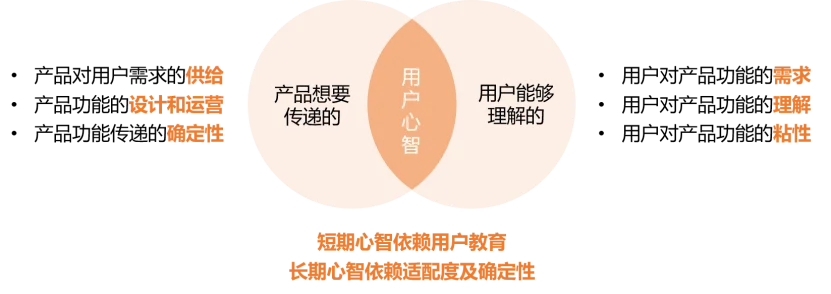 - 用户心智其实就是产品想要传递的价值、和用户能够理解的价值中间的交叉:交叉面积越多,代表着用户对于产品的心智越强,直接结果则体现在用户使用粘性更高(购买频次、复购率、X月留存等等)。