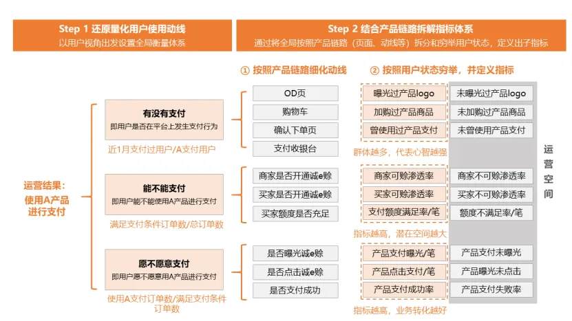 基于上述对于商业逻辑的认知、解构、重构,我门明确了四个基本大方针:拓流量、提转化、提动销、保留存。由于电商场景是双边甚至多边市场,还会涉及不同的交易角色和使用角色,这里就会涉及到将已经拆解好的数据指标和市场行为进行再次结合和罗列,逐步将数据指标体系立体化。如何做好产品指标体系的拆解?以用户使用A产品支付为例1.量化还原用户使用动线,梳理用户视角的产品环节:以用户使用A产品支付为例,运营结果是希望用户尽量的使用A产品支付(支付GMV越多,对应的业务营收越多),从用户角度上主要分为三个环节:①有没有支付,即用户是否在平台上发生了支付行为,有支付行为才有进一步转化的基础;②能不能支付,即用户能不能使用A产品支付,具备能支付的条件才有进一步转化的潜在可能;③愿不愿意支付,在满足了能支付的前提条件后,用户愿不愿意支付则是业务最后的转化漏斗,用户意愿度往往也是最难运营的指标。2.根据用户使用动线,再结合产品链路拆解指标体系:根据产品链路细化动线,结合平台场景、用户状态去拆解下钻:
