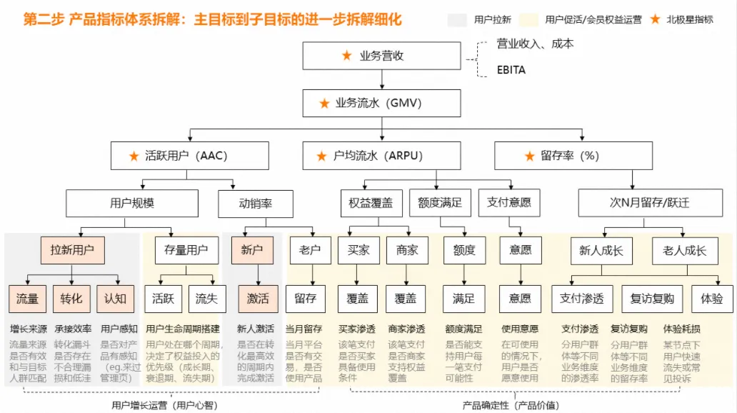 对数据指标体系和子指标拆解的越细,越有利于我们的运营策略输出、以及对策略方向的取舍。比如在定财年目标时,我们可以非常清晰的根据今年的目标反推到各个环节的子目标增长上。举例,业务营收=活跃用户量*户均流水*留存率,总目标增长50%可以被拆解到各个漏斗的增长目标上(如活跃用户量增长20%,户均流水需增长20%,留存率增长10%等),甚至可以下拆到各个漏斗环节。如何做好产品指标体系的重构?1.一级指标为目标服务,二级指标为策略服务:运营策略是围绕北极星指标服务而存在的,比如北极星目标是用户规模XX、户均流水规模XX、用户留存率XX,那么对应的策略就是提升规模引入、做厚用户采购深度、提升用户留存率。2.三级指标为手段服务,多个手段则构成了运营策略:在以上的目标和策略牵引下,我们对应的手段则是a)提升规模引入,一方面可以提升新客的开通(拓曝光、提转化),另一方面可以提升老客的留存(强心智、降流失),最终是希望用户规模保持在XX水平——>对应的三级指标:曝光UV、点击UV、点击转化率、跳失率、停留时长,同时可以根据访问阵地(新客开通页、老客管理页)b)做厚用户采购深度,一方面可以不断优化用户支付动线上的转化和承接,提升用户意愿度(可以是发放权益、红包等),让用户在支付时尽量使用A产品支付,另一方面可以提升用户可支付的底盘(即额度满足,比如通过资质审核给予更多额度,或者大促时发放临时额度)c)提升用户留存率,这个是最难运营的,一方面可以通过把存量用户的通过生命周期的分层做区分,筛选出来高活跃用户做定向运营,以及低中活跃的跃迁运营(可以是升级后给与账期/额度/权益等手段),另一方面可以通过对比低、中、高活跃度运营行为上的差异,来找拐点,并聚焦拐点的关键行为进行攻坚。3.运营策略(北极星指标)轻易不变,手段需要快速迭代、不断调优