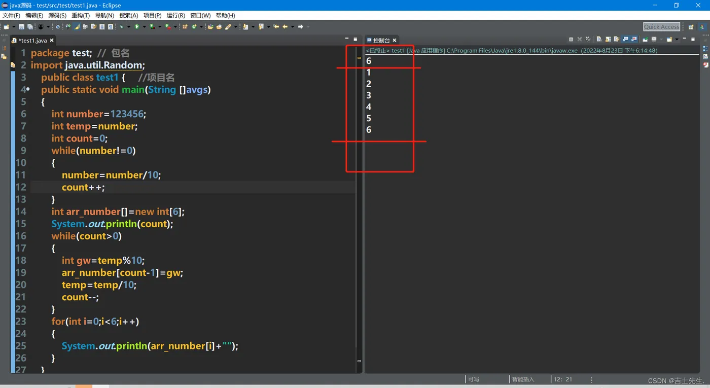 package test; // 包名 import java.util.Random; public class test1 { //项目名 public static void main(String []avgs) { int number=123456; int temp=number; int count=0; while(number!=0) { number=number/10; count++; } int arr_number[]=new int[6]; System.out.println(count); while(count>0) { int gw=temp%10; arr_number[count-1]=gw; temp=temp/10; count--; } for(int i=0;i<6;i++) { System.out.println(arr_number[i]+""); } } }