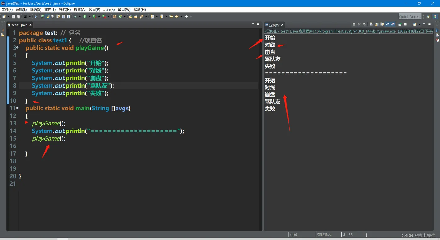 package test; // 包名 public class test1 { //项目名 public static void playGame() { System.out.println("开始"); System.out.println("对线"); System.out.println("崩盘"); System.out.println("骂队友"); System.out.println("失败"); } public static void main(String []avgs) { playGame(); System.out.println("===================="); playGame(); } }