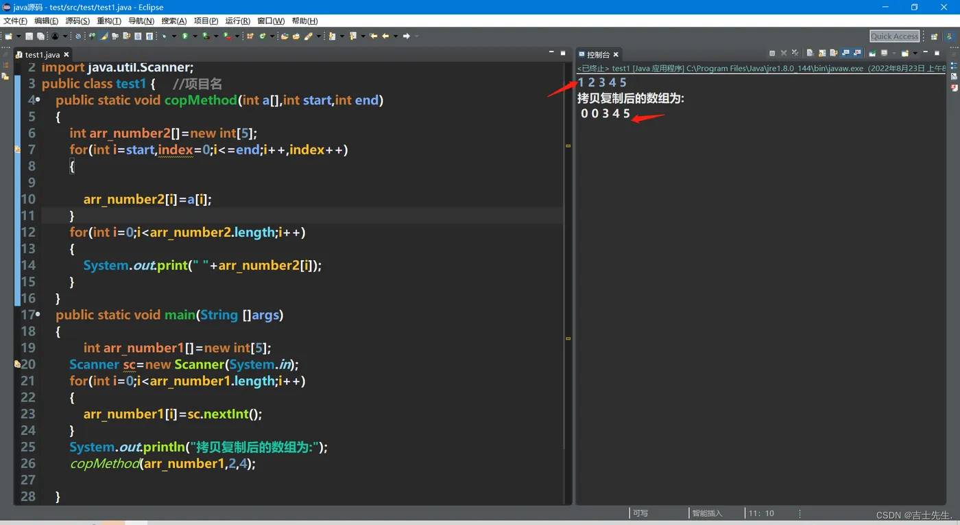 package test; // 包名 import java.util.Scanner; public class test1 { //项目名 public static void copMethod(int a[],int start,int end) { int arr_number2[]=new int[5]; for(int i=start,index=0;i<=end;i++,index++) { arr_number2[i]=a[i]; } for(int i=0;i<arr_number2.length;i++) { System.out.print(" "+arr_number2[i]); } } public static void main(String []args) { int arr_number1[]=new int[5]; Scanner sc=new Scanner(System.in); for(int i=0;i<arr_number1.length;i++) { arr_number1[i]=sc.nextInt(); } System.out.println("拷贝复制后的数组为:"); copMethod(arr_number1,2,4); } }
