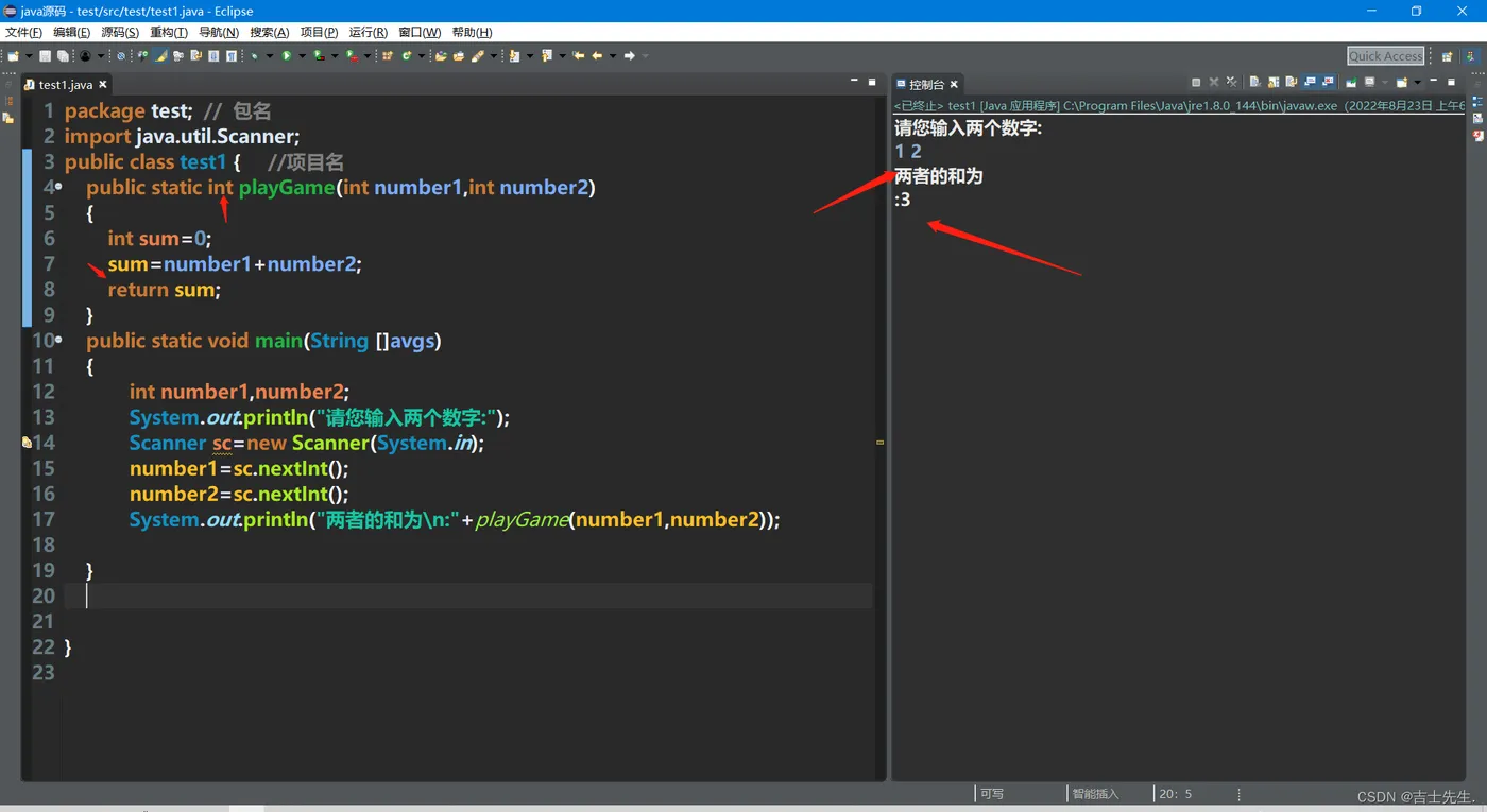 package test; // 包名 import java.util.Scanner; public class test1 { //项目名 public static int playGame(int number1,int number2) { int sum=0; sum=number1+number2; return sum; } public static void main(String []avgs) { int number1,number2; System.out.println("请您输入两个数字:"); Scanner sc=new Scanner(System.in); number1=sc.nextInt(); number2=sc.nextInt(); System.out.println("两者的和为\n:"+playGame(number1,number2)); } }