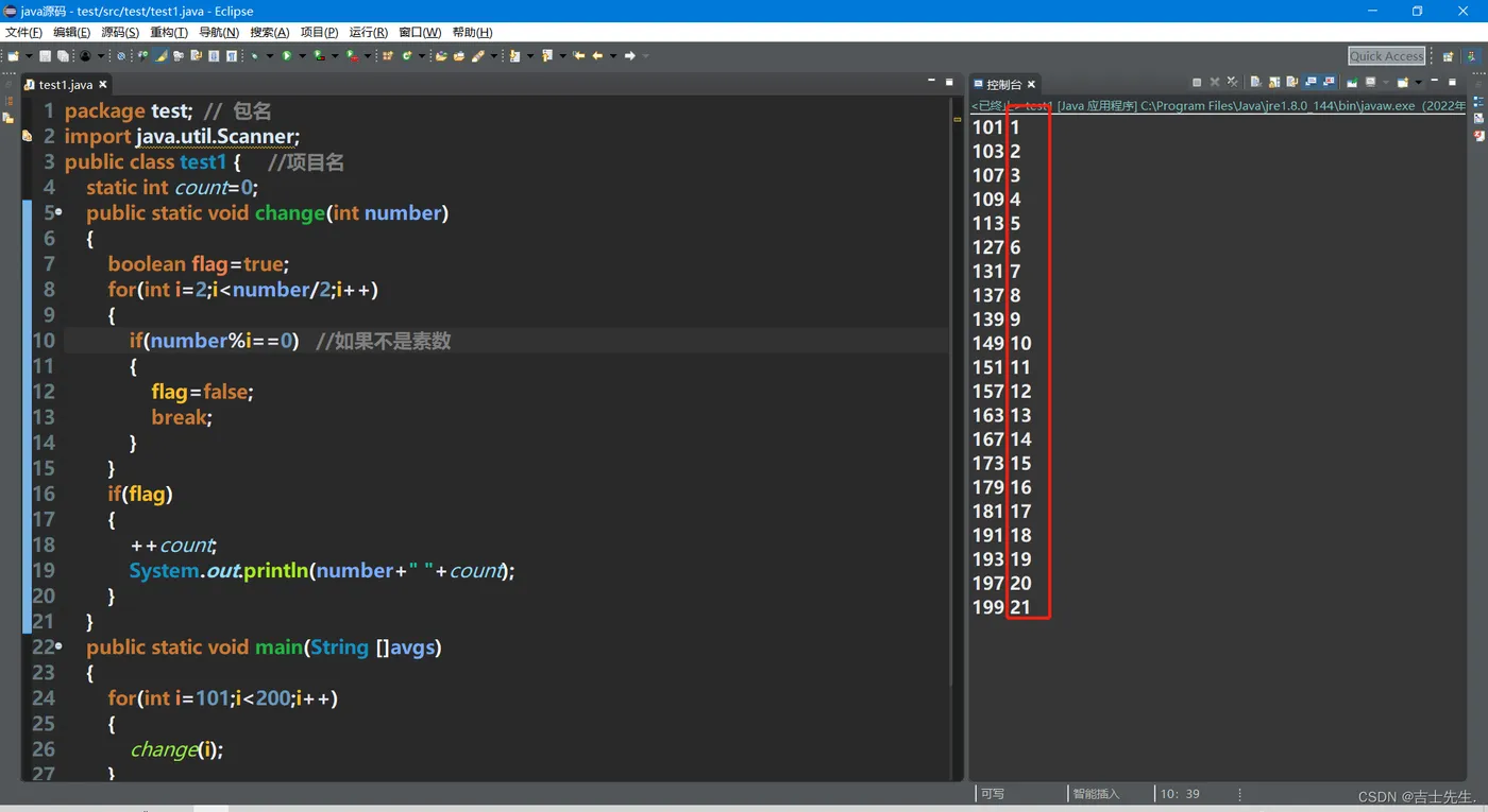 package test; // 包名 import java.util.Scanner; public class test1 { //项目名 static int count=0; // 定义全局变量,只为了求个数 public static void change(int number) { boolean flag=true; for(int i=2;i<number/2;i++) { if(number%i==0) //如果不是素数 { flag=false; break; } } if(flag) //注意这里省略了 !=0 { ++count; System.out.println(number+" "+count); } } public static void main(String []avgs) { for(int i=101;i<200;i++) { change(i); } } }