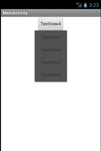 1 public class MainActivity extends Activity { 2 3 private SpinnerButton mSpinnerBtn; 4 5 @Override 6 public void onCreate(Bundle savedInstanceState) { 7 super.onCreate(savedInstanceState); 8 setContentView(R.layout.main); 9 10 this.mSpinnerBtn = (SpinnerButton) this 11 .findViewById(R.id.spinner_btn); 12 13 // 设置下拉布局资源文件,布局创建监听器,以便实例化控件对象 14 mSpinnerBtn.setResIdAndViewCreatedListener(R.layout.spinner_dropdown_items, 15 new SpinnerButton.ViewCreatedListener(){ 16 @Override 17 public void onViewCreated(View v) { 18 19 // TODO Auto-generated method stub 20 v.findViewById(R.id.textView1).setOnClickListener(new View.OnClickListener() { 21 @Override 22 public void onClick(View v) { 23 // TODO Auto-generated method stub 24 handleClick(((TextView)v).getText().toString()); 25 } 26 }); 27 v.findViewById(R.id.textView2).setOnClickListener(new View.OnClickListener() { 28 @Override 29 public void onClick(View v) { 30 // TODO Auto-generated method stub 31 handleClick(((TextView)v).getText().toString()); 32 } 33 }); 34 v.findViewById(R.id.textView3).setOnClickListener(new View.OnClickListener() { 35 @Override 36 public void onClick(View v) { 37 // TODO Auto-generated method stub 38 handleClick(((TextView)v).getText().toString()); 39 } 40 }); 41 v.findViewById(R.id.textView4).setOnClickListener(new View.OnClickListener() { 42 @Override 43 public void onClick(View v) { 44 // TODO Auto-generated method stub 45 handleClick(((TextView)v).getText().toString()); 46 } 47 }); 48 } 49 50 }); 51 } 52 53 private void handleClick(String text){ 54 mSpinnerBtn.dismiss(); 55 mSpinnerBtn.setText(text); 56 } 57 }