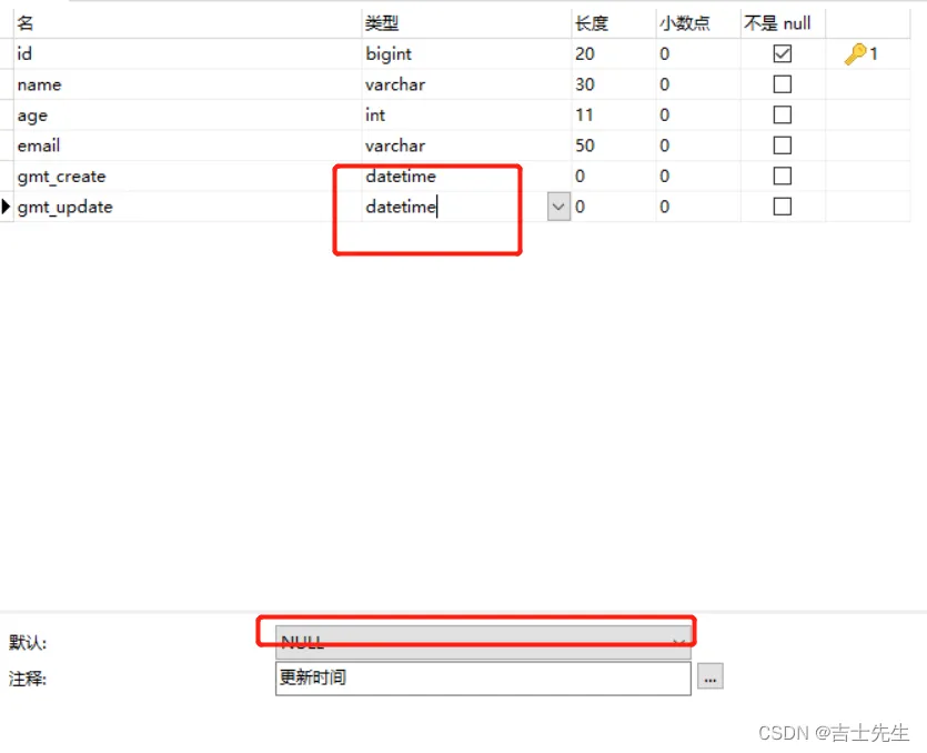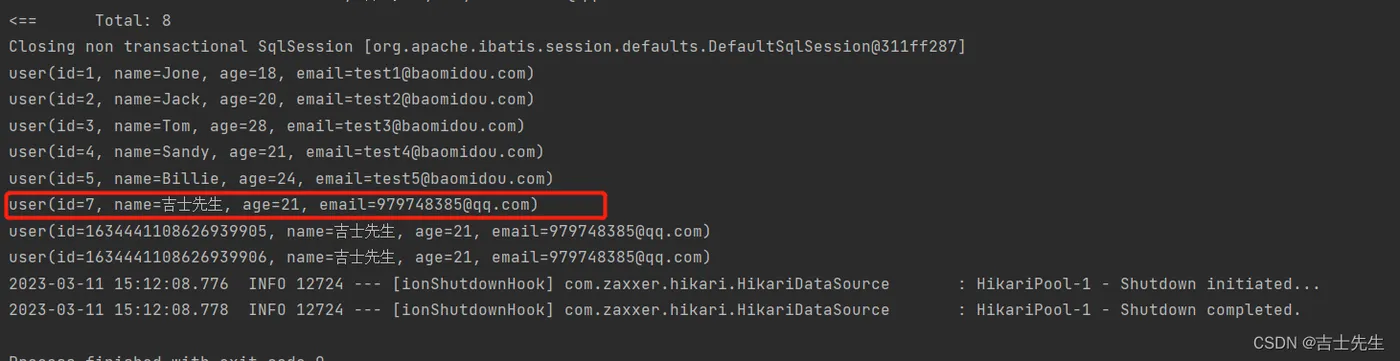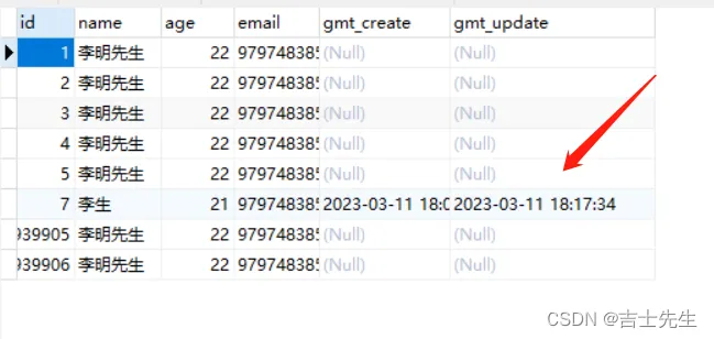 // 测试插入 @Test public void testInsert(){ user user = new user(); user.setName("吉士先生"); user.setAge(21); user.setEmail("979748385@qq.com"); int insert = userMapper.insert(user); System.out.println(insert); }