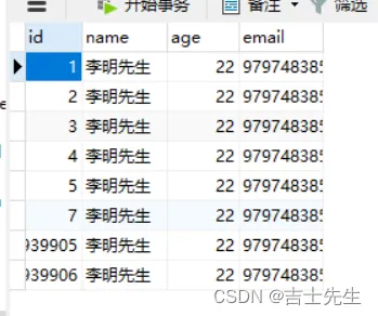 // 测试插入 @Test public void testInsert(){ user user = new user(); user.setName("吉士先生"); user.setAge(21); user.setEmail("979748385@qq.com"); user.setId(7L); int insert = userMapper.insert(user); System.out.println(insert); }
