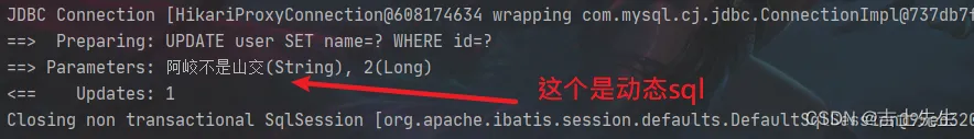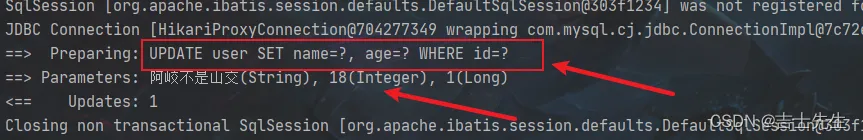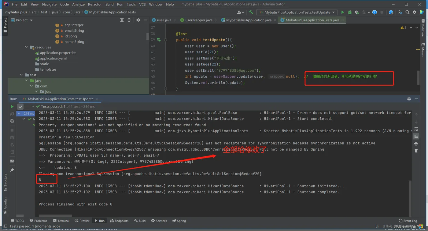 // 测试修改 @Test public void testUpdate(){ user user = new user(); user.setId(7L); user.setName("李生"); user.setAge(11); user.setEmail("979748385@qq.com"); int update = userMapper.updateById(user); // 增删改的返回值,其实就是被改变的行数 System.out.println(update); }