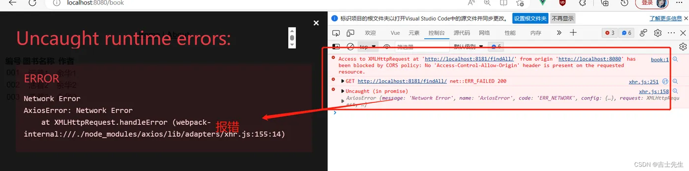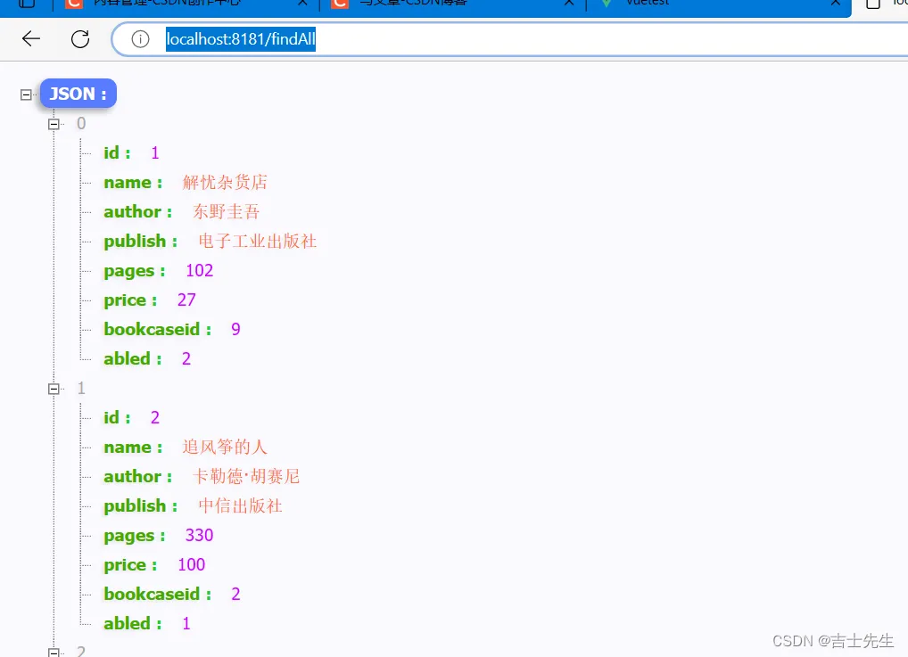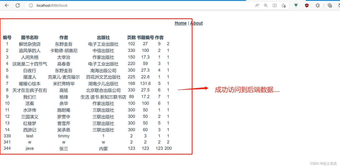 引入我们的axios插件 import axios from 'axios' 进行请求 mounted(){ // 在这个页面创建的时候,就初始化上去 const _this=this; axios.get('http://localhost:8181/findAll/').then(function(resp){ _this.books=resp.data; // 这里的this指向的是这个函数的this。所以我们用_this来指向vm console.log(resp.data) }) }