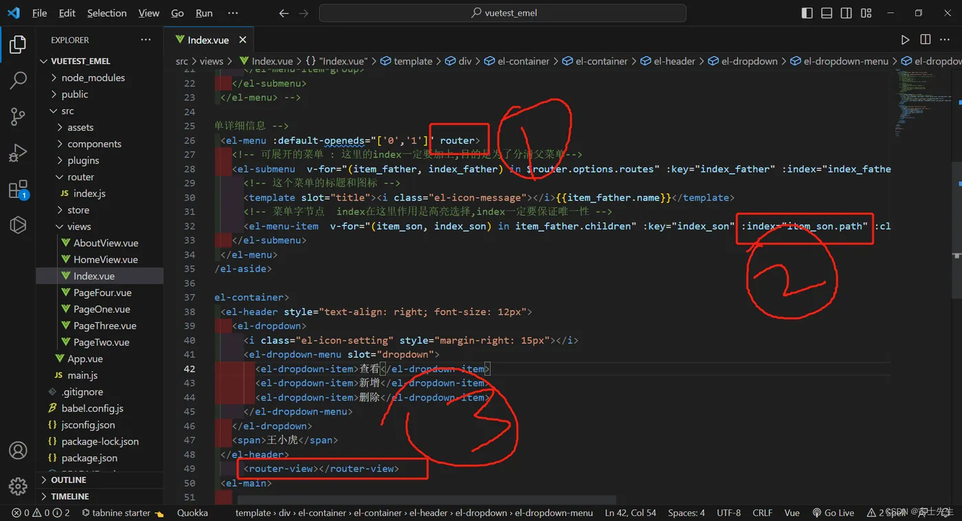 父路由页面中添加< router-view>标签,它是一个容器,动态渲染你选择的子路由router。 < el-menu-item>标签的index值就是要跳转的 路由