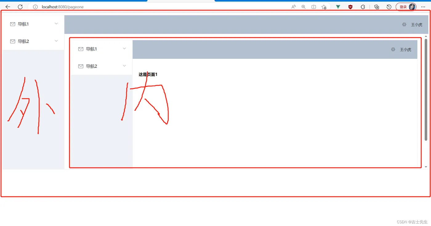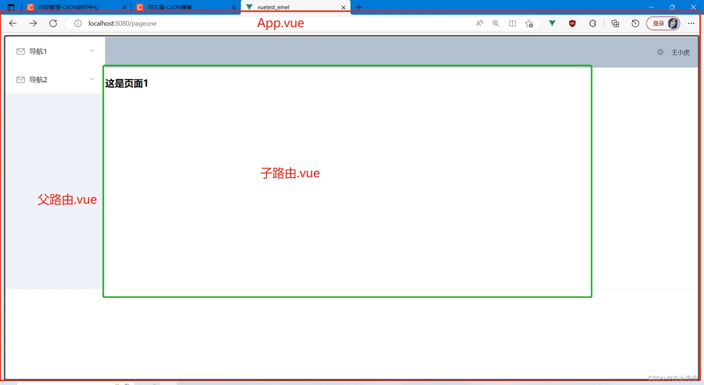 在Vue中儿子类是展现在父Vue组件的身体中的。又因为我们在配置路由的时候把这个父类设置成了App.vue这个组件,所以最里面的内嵌套我们可以理解了。 - 外层: 我们因为在App.vue组件中搭建了框架,又通过router-view这个路由展现的操作,所以实现了对内层的嵌套。