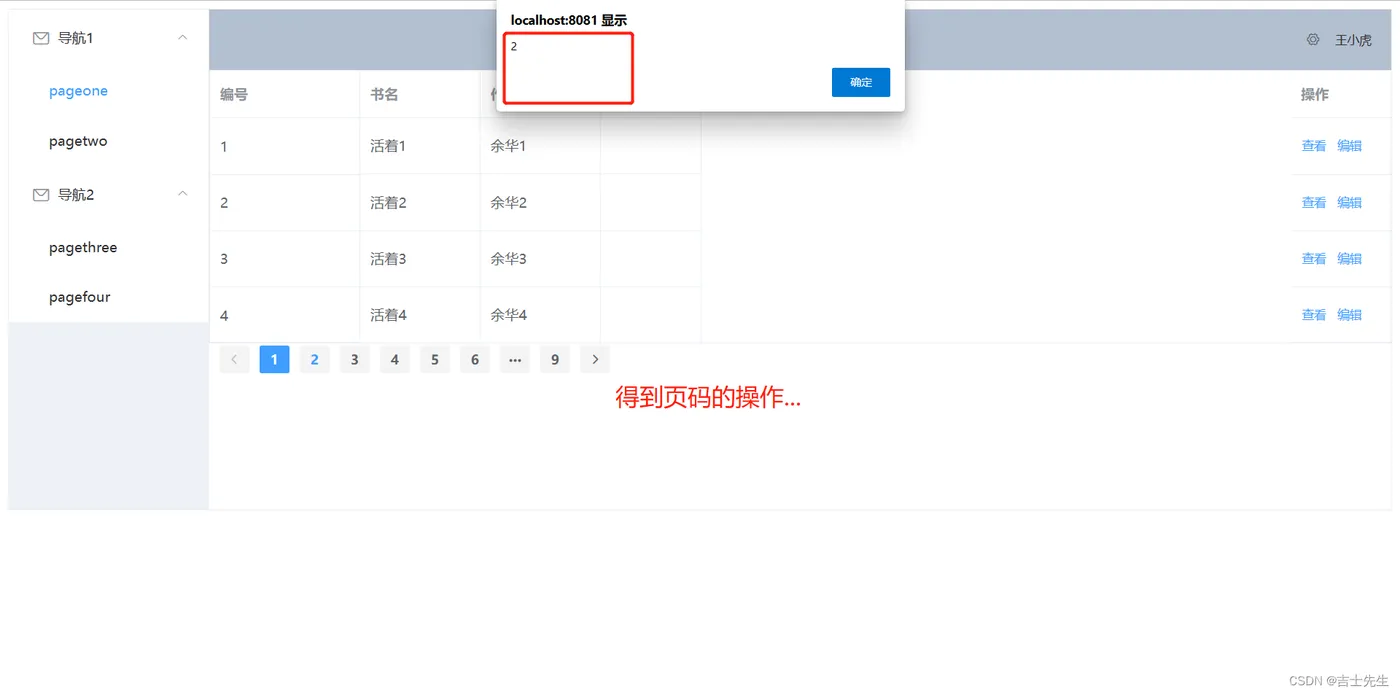 <template> <div> <el-table :data="tableData" border style="width: 100%"> <el-table-column fixed prop="id" label="编号" width="150" ></el-table-column> <el-table-column prop="name" label="书名" width="120"> </el-table-column> <el-table-column prop="author" label="作者" width="120"></el-table-column> <el-table-column fixed="right" label="操作" width="100"> <template slot-scope="scope"> <el-button @click="handleClick(scope.row)" type="text" size="small" >查看</el-button > <el-button type="text" size="small">编辑</el-button> </template> </el-table-column> </el-table> <!-- 分页的操作 --> <el-pagination background layout="prev, pager, next" page-size="6" :total="50" @current-change="page"></el-pagination> </div> </template> <script> export default { methods: { handleClick(row) { console.log(row); }, page(currentpage){ //得到的参数是我们的页码 alert(currentpage) } }, data() { return { tableData: [ { id: "1", name: "活着1", author: "余华1", }, { id: "2", name: "活着2", author: "余华2", }, { id: "3", name: "活着3", author: "余华3", }, { id: "4", name: "活着4", author: "余华4", }, ], }; }, }; </script>