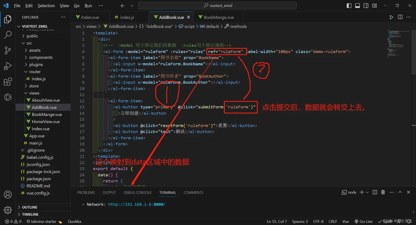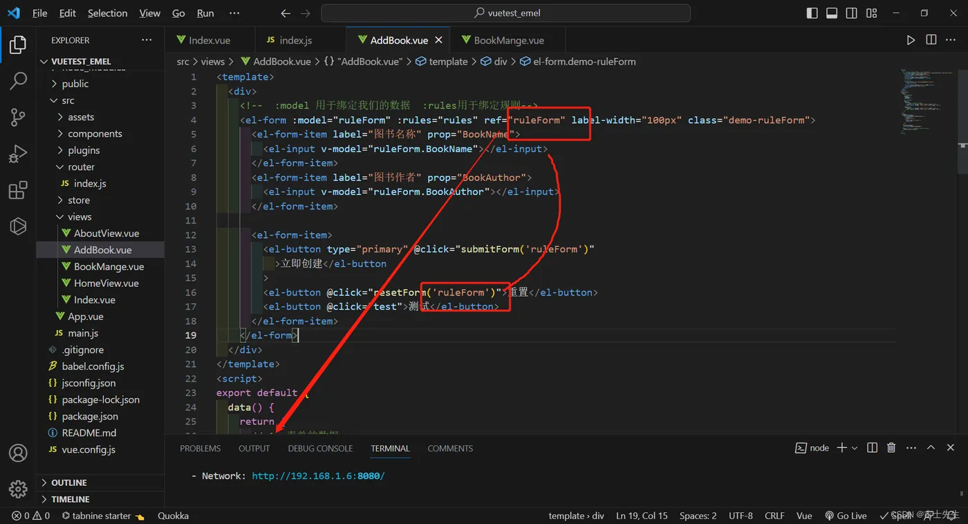 1.绑定表单 :model="ruleForm" <!-- :model 用于绑定我们的数据 :rules用于绑定规则--> <el-form :model="ruleForm" :rules="rules" ref="ruleForm" label-width="100px" class="demo-ruleForm"> <el-form-item label="图书名称" prop="BookName"> <el-input v-model="ruleForm.BookName"></el-input> </el-form-item> <el-form-item label="图书作者" prop="BookAuthor"> <el-input v-model="ruleForm.BookAuthor"></el-input> </el-form-item> <el-form-item> <el-button type="primary" @click="submitForm('ruleForm')" >立即创建</el-button > <el-button @click="resetForm('ruleForm')">重置</el-button> <el-button @click="test">测试</el-button> </el-form-item> </el-form> 2.数据 data() { return { // 1. 表单的数据 ruleForm: { BookName: "", BookAuthor: "", }, // 2. 校验的规则 rules: { BookName: [ // 是否强制? 提示信息? 触发条件? { required: true, message: "请输入图书名称", trigger: "blur" }, { min: 3, max: 5, message: "长度在 3 到 5 个字符", trigger: "blur" }, ], BookAuthor: [ { required: true, message: "请输入图书作者", trigger: "blur" }, { min: 3, max: 5, message: "长度在 3 到 5 个字符", trigger: "blur" }, ], }, }; },