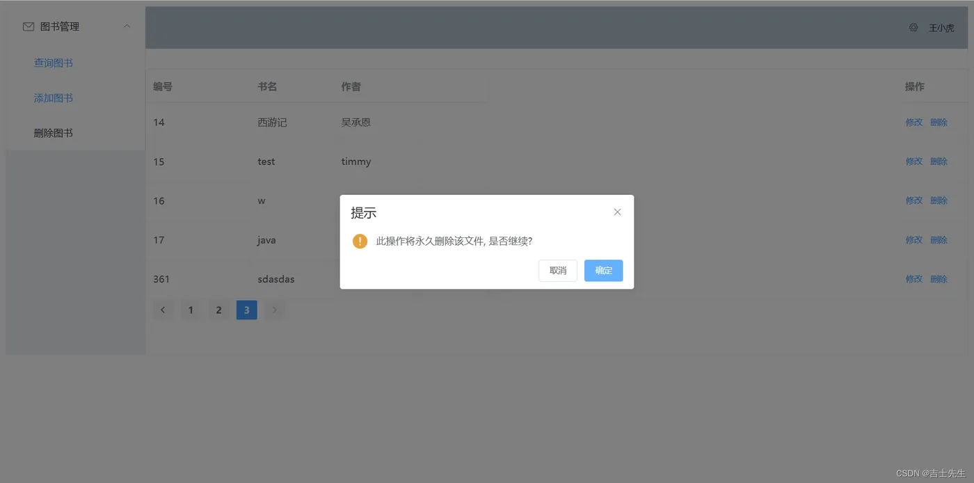 1.传递本行的信息 <el-button type="text" size="small" @click="delete_one(scope.row)">删除</el-button 2.进行删除 methods{ // 删除的操作 delete_one(row) { console.log("sdsdsd", row); const _this = this; axios; this.$confirm("此操作将永久删除该文件, 是否继续?", "提示", { confirmButtonText: "确定", cancelButtonText: "取消", type: "warning", }) .then(() => { this.$message({ type: "success", message: "删除成功!", }); axios .get("http://localhost:8181/deletedid/" + row.id) .then(function (respsone) { console.log("删除->", respsone); _this.$router.push("/AddBook"); }); }) .catch(() => { this.$message({ type: "info", message: "已取消删除", }); }); }, },
