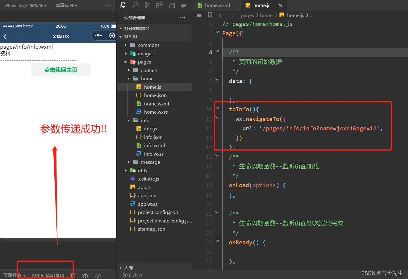 // pages/home/home.js Page({ /** * 页面的初始数据 */ data: { }, toInfo(){ wx.navigateTo({ url: '/pages/info/info?name=jsxs1&age=12', }) } })