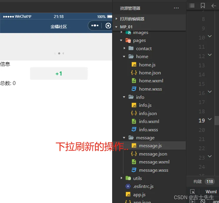 // pages/message/message.js Page({ /** * 页面的初始数据 */ data: { count:0 }, addCount(){ console.log('this->',this) this.setData({ count:this.data.count+1 }) }, /** * 页面相关事件处理函数--监听用户下拉动作 */ onPullDownRefresh() { this.setData({ count:0 }) // 当数据重置成功之后,调用此函数,关闭下拉刷新的效果 wx.stopPullDownRefresh() }, })