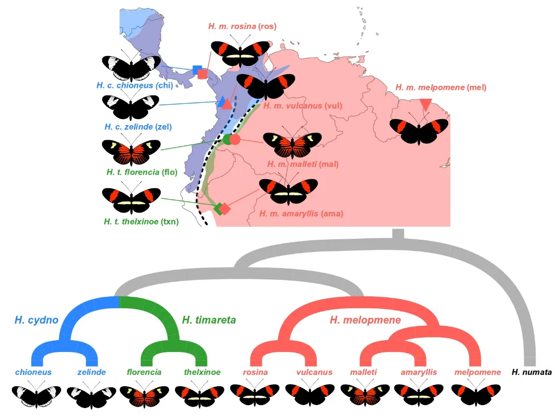 我们将研究三个物种的多个种族:Heliconius melpomene、Heliconius timareta 和 Heliconius cydno。这些物种的分布范围部分重叠,人们认为它们在同源地区发生杂交。我们的样本集包括来自巴拿马和哥伦比亚安第斯山脉西坡的两对同域种群 H. melpomene 和 H. cydno。在哥伦比亚和秘鲁的安第斯山脉东坡,还有两对同域种群:H. melpomene 和 H. timareta。最后,有两个来自外群物种 Heliconius numata 的样本,这是进行 ABBA BABA 分析所必需的。