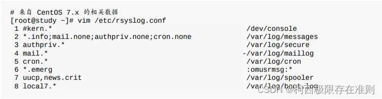 下面标注着reyslogd的系统服务记录,/etc/rsyslog.conf 这个文件的默认内容。