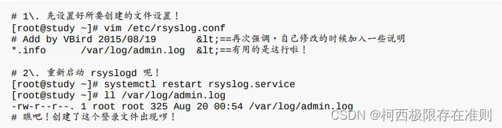 需要特殊的文件来帮你记录时,千万给他记录在/etc/rsyslog.conf 当中,如此一来,你就可以重复的将许多的信息记录在不同的文件当中,以方便你的管理。