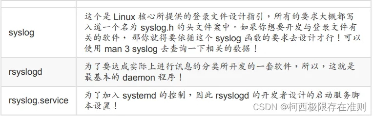 早期 CentOS 5.x 以前,要达成syslog 的功能是由一只名为 syslogd 的 daemon 来完成的, 从 CentOS 6 以来 (包含CentOS 7) 则是通过 rsyslogd 这个 daemon。