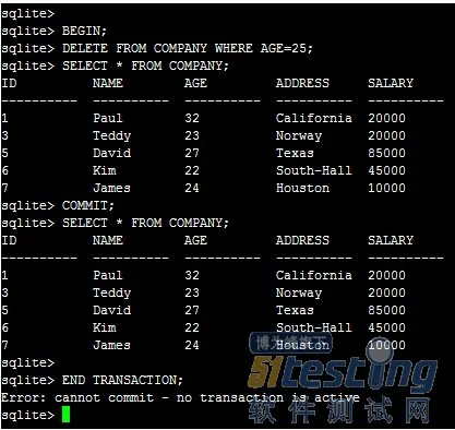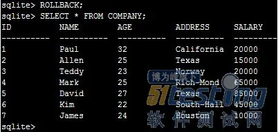 再ROLLBACK,再去查询COMPANY表,会看到AGE为25的记录被恢复。