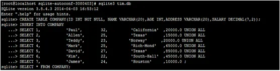 sqlite> CREATE TABLE COMPANY(ID INT NOT NULL, NAME VARCHAR(20),AGE INT,ADDRESS VARCHAR(20),SALARY DECIMAL(7,2));