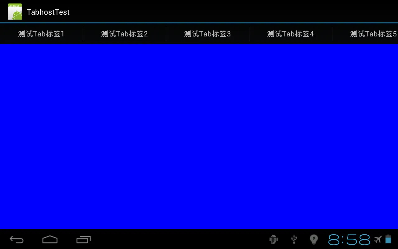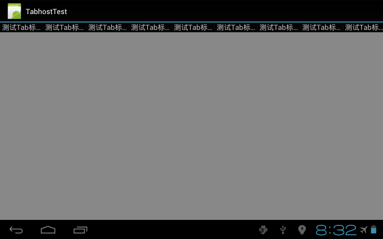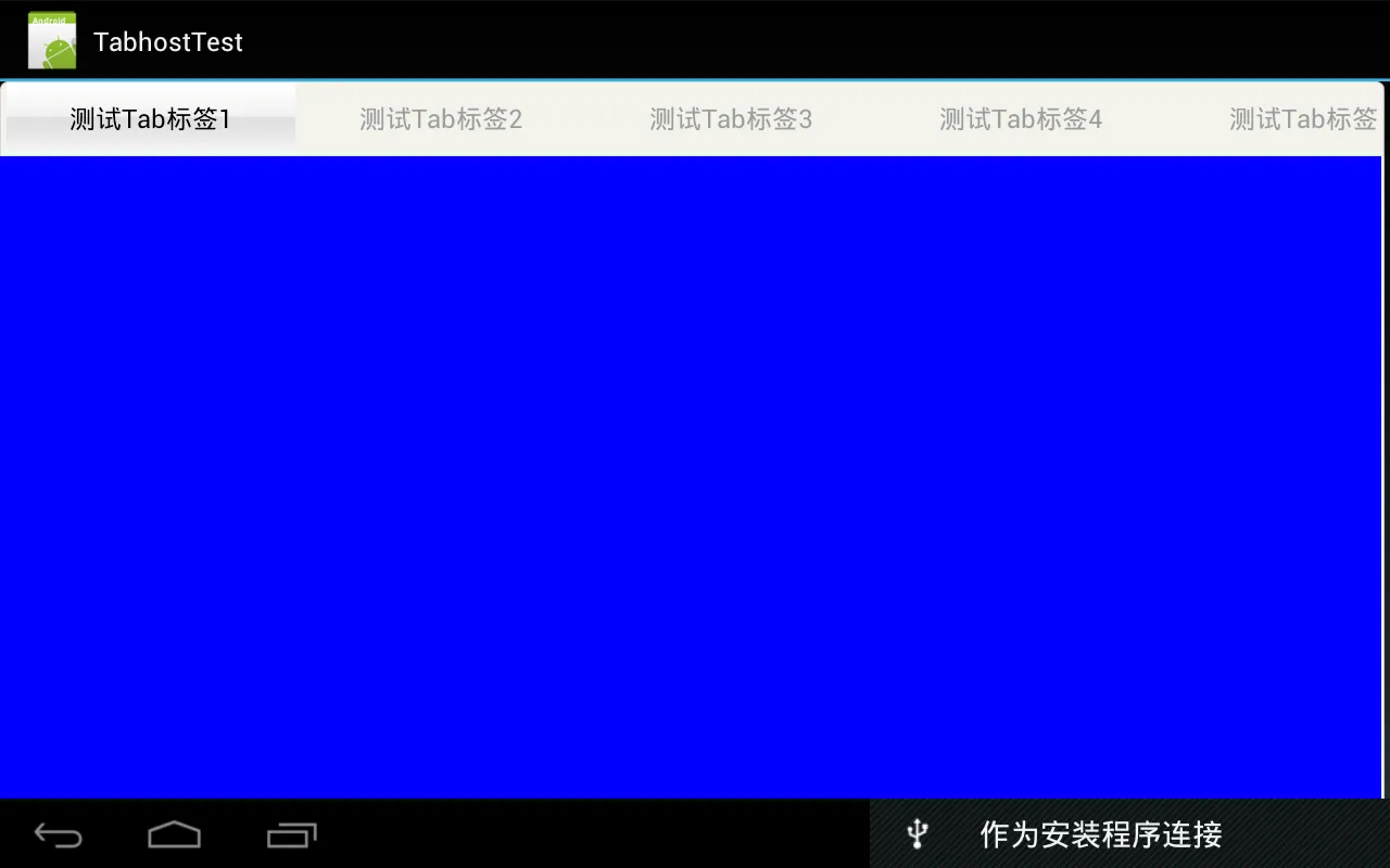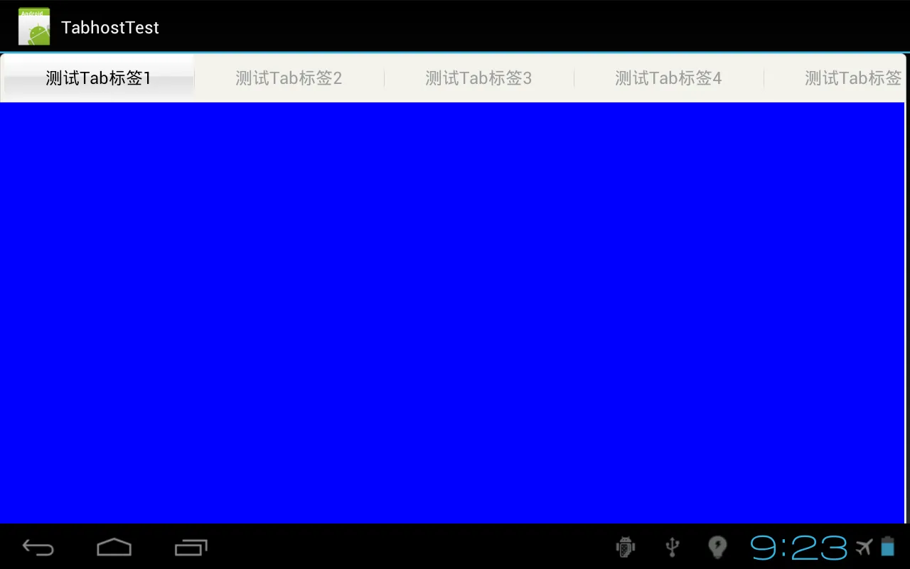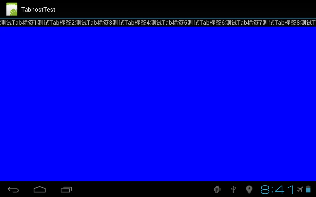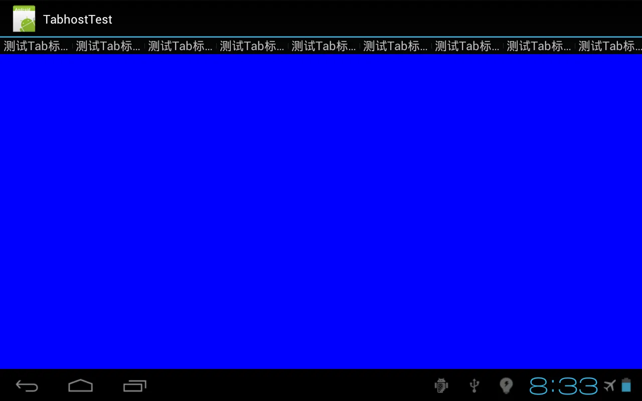 1 public class TabhostTestActivity extends TabActivity implements 2 TabContentFactory { 3 private final String[] tabTitle = { "测试Tab标签1", "测试Tab标签2", "测试Tab标签3", 4 "测试Tab标签4", "测试Tab标签5", "测试Tab标签6", "测试Tab标签7", "测试Tab标签8", 5 "测试Tab标签9" }; 6 7 /** Called when the activity is first created. */ 8 @Override 9 public void onCreate(Bundle savedInstanceState) { 10 super.onCreate(savedInstanceState); 11 setContentView(R.layout.tabhost); 12 TabHost th = getTabHost(); 13 for (int i = 0; i < tabTitle.length; i++) { 14 TextView view = (TextView) getLayoutInflater().inflate( 15 R.layout.tabwighet, null); 16 view.setText(tabTitle[i]); 17 th.addTab(th.newTabSpec(tabTitle[i]).setIndicator(view) 18 .setContent(this)); 19 } 20 } 21 22 @Override 23 public View createTabContent(String tag) { 24 View view = new View(this); 25 if (tabTitle[0].equals(tag)) { 26 view.setBackgroundColor(Color.BLUE); 27 } else if (tabTitle[1].equals(tag)) { 28 view.setBackgroundColor(Color.CYAN); 29 } else if (tabTitle[2].equals(tag)) { 30 view.setBackgroundColor(Color.DKGRAY); 31 } else if (tabTitle[3].equals(tag)) { 32 view.setBackgroundColor(Color.GRAY); 33 } else if (tabTitle[4].equals(tag)) { 34 view.setBackgroundColor(Color.GREEN); 35 } else if (tabTitle[5].equals(tag)) { 36 view.setBackgroundColor(Color.LTGRAY); 37 } else if (tabTitle[6].equals(tag)) { 38 view.setBackgroundColor(Color.MAGENTA); 39 } else if (tabTitle[7].equals(tag)) { 40 view.setBackgroundColor(Color.RED); 41 } else if (tabTitle[8].equals(tag)) { 42 view.setBackgroundColor(Color.YELLOW); 43 } 44 return view; 45 } 46 }