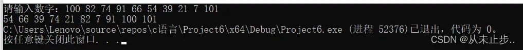 #include<stdio.h> void main() { int i, j,a[10],temp; printf("请输入数字:"); for (i = 0; i < 10; i++)//输入数组元素 scanf_s("%d", &a[i]); for (i = 1; i < 10; i++)//使用双重循环对元素进行比较并排序 { for (j = 0; j < i; j++) { if (a[j] > a[j+1]) { temp = a[j];//不能直接使用赋值进行交换 a[j] = a[j+1]; a[j+1] = temp; } } } for (i = 0; i < 10; i++)//再使用for循环对元素进行输出,不能在上面排序的循环中输出 printf("%d ", a[i]); }