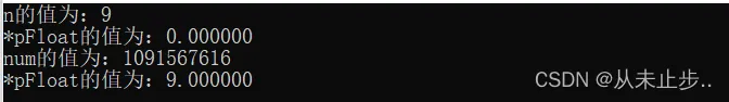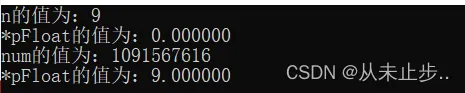 #include<stdio.h> int main() { int n = 9; float* pFloat = (float*)&n;//定义浮点型指针pFloat指向n,注意:由于指针pFloat的类型和n的类型不相同,因此我们需要进行强制转化。 printf("n的值为:%d\n", n); printf("*pFloat的值为:%f\n", *pFloat);//对指针进行解引用,以浮点数的形式进行输出 *pFloat = 9.0;//令指针解引用后的值为9.0 printf("num的值为:%d\n", n); printf("*pFloat的值为:%f\n", *pFloat); return 0; }