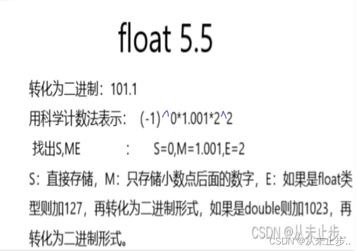 举例来说:十进制的5.0,写成二进制是101.0,相当于1.012的二次方(这里用到了科学计数法的表示),那么,按照上面V的格式,可以得出s=0,M=1.01,E=2