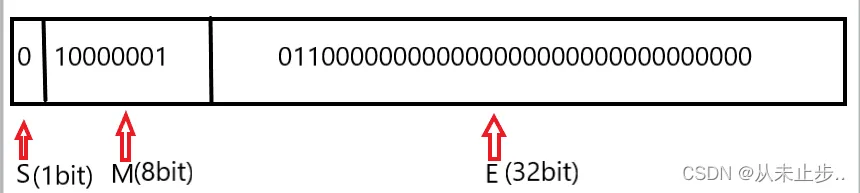 如果是十进制的-5.0,写成二进制是-101.0,相当于-1.012的两次方,那么按照上面的格式,s=1,M=1.01,E=2