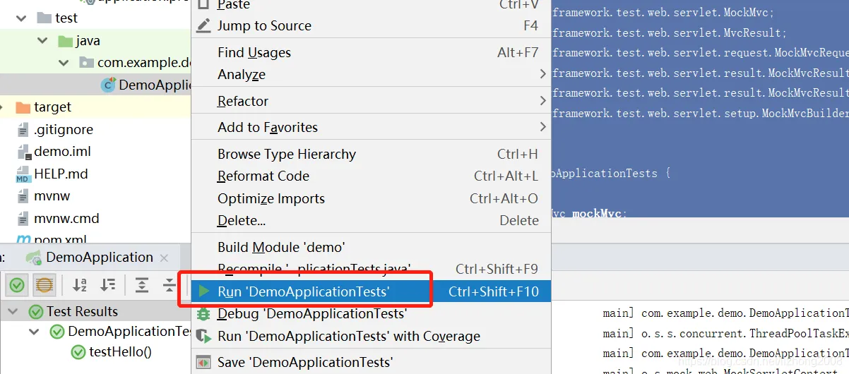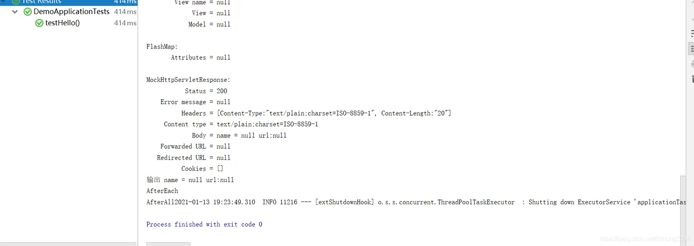 package com.example.demo; import org.junit.jupiter.api.*; import org.springframework.boot.test.context.SpringBootTest; import org.springframework.test.web.servlet.MockMvc; import org.springframework.test.web.servlet.MvcResult; import org.springframework.test.web.servlet.request.MockMvcRequestBuilders; import org.springframework.test.web.servlet.result.MockMvcResultHandlers; import org.springframework.test.web.servlet.result.MockMvcResultMatchers; import org.springframework.test.web.servlet.setup.MockMvcBuilders; @SpringBootTest public class DemoApplicationTests { private MockMvc mockMvc; @BeforeAll public static void BeforeAll() { System.out.println("BeforeAll" ); } @BeforeEach public void setUp() throws Exception { mockMvc = MockMvcBuilders.standaloneSetup(new HelloController()).build(); } @Test public void testHello() throws Exception { MvcResult mvcResult = mockMvc.perform(MockMvcRequestBuilders.get("/hello")) .andExpect(MockMvcResultMatchers.status().isOk()) .andDo(MockMvcResultHandlers.print()) .andReturn(); System.out.println("输出 " + mvcResult.getResponse().getContentAsString()); } @AfterEach public void AfterEach() { System.out.println("AfterEach" ); } @AfterAll public static void AfterAll() { System.out.println("AfterAll" ); } }