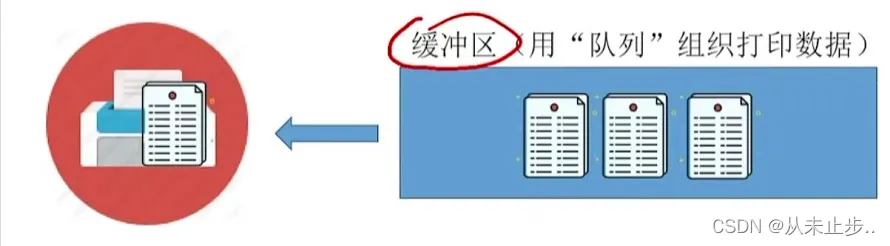 假设有一位同学,他需要打印论文,但是由于论文很长,需要一定时间去打印,因此在打印机为该同学工作的过程中,打印数据的缓冲区就会将其他同学要打印的内容组成一个“队列”。