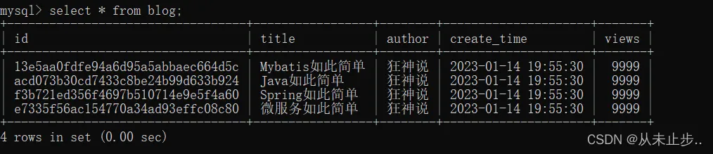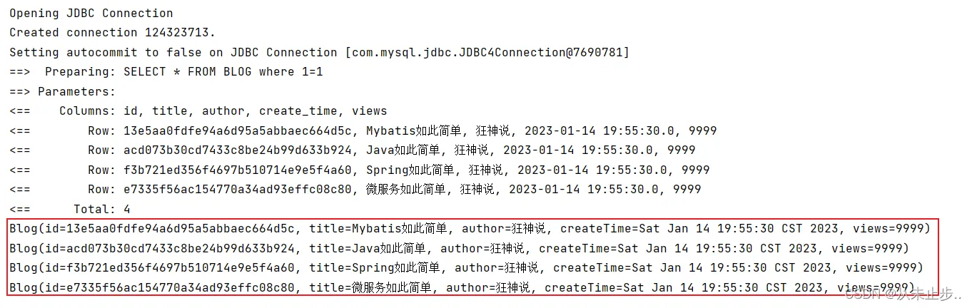 package dao.user; import dao.BlogMapper; import org.apache.ibatis.session.SqlSession; import org.junit.Test; import pojo.Blog; import utils.IDutils; import utils.mybatis_utils; import java.util.Date; public class MyTest { @Test public void addInitBlog() { SqlSession session = mybatis_utils.getSqlSession(); BlogMapper mapper = session.getMapper(BlogMapper.class); //新建实体类,插入数据 Blog blog = new Blog(); blog.setId(IDutils.getId()); blog.setTitle("Mybatis如此简单"); blog.setAuthor("狂神说"); blog.setCreateTime(new Date()); blog.setViews(9999); mapper.addBlog(blog); blog.setId(IDutils.getId()); blog.setTitle("Java如此简单"); mapper.addBlog(blog); blog.setId(IDutils.getId()); blog.setTitle("Spring如此简单"); mapper.addBlog(blog); blog.setId(IDutils.getId()); blog.setTitle("微服务如此简单"); mapper.addBlog(blog); session.commit(); session.close(); } }