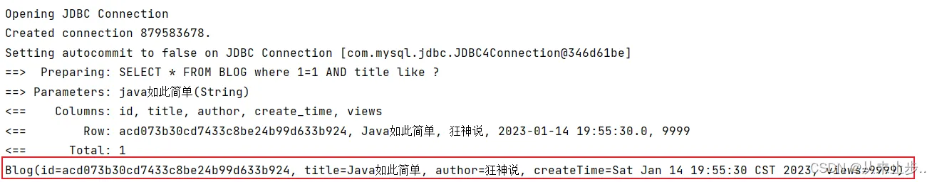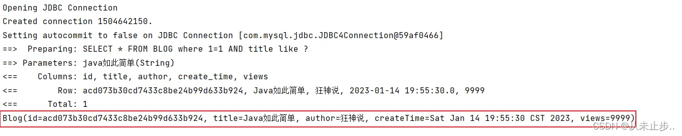 <?xml version="1.0" encoding="UTF-8" ?> <!DOCTYPE mapper PUBLIC "-//mybatis.org//DTD Config 3.0//EN" "https://mybatis.org/dtd/mybatis-3-mapper.dtd"> <mapper namespace="dao.BlogMapper"> <select id="queryBlogIF" resultType="Blog"> SELECT * FROM BLOG where 1=1 <if test="title != null"> AND title like #{title} </if> </select> </mapper>