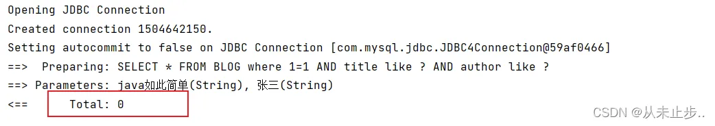 <select id="queryBlogIF" resultType="Blog"> SELECT * FROM BLOG where 1=1 <if test="title != null"> AND title like #{title} </if> <if test="author != null"> AND author like #{author} </if> </select>