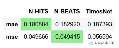 从上图可以看出,N-HiTS获得最低的MAE,而N-BEATS获得最低的MSE。MAE的差异为0.002,MSE的差异为0.00025。由于MSE的差异非常小,特别是考虑到误差是平方的,所以我认为N-HiTS是这项任务的首选模型。