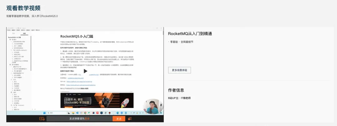 2、观看教学视频:观看零基础教学视频,深入学习 RocketMQ 5.0,同时还可以体验 RocketMQ 的实践场景。