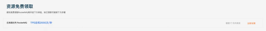 1、玩转云产品:领取资源完成【免费领取 RocketMQ】。