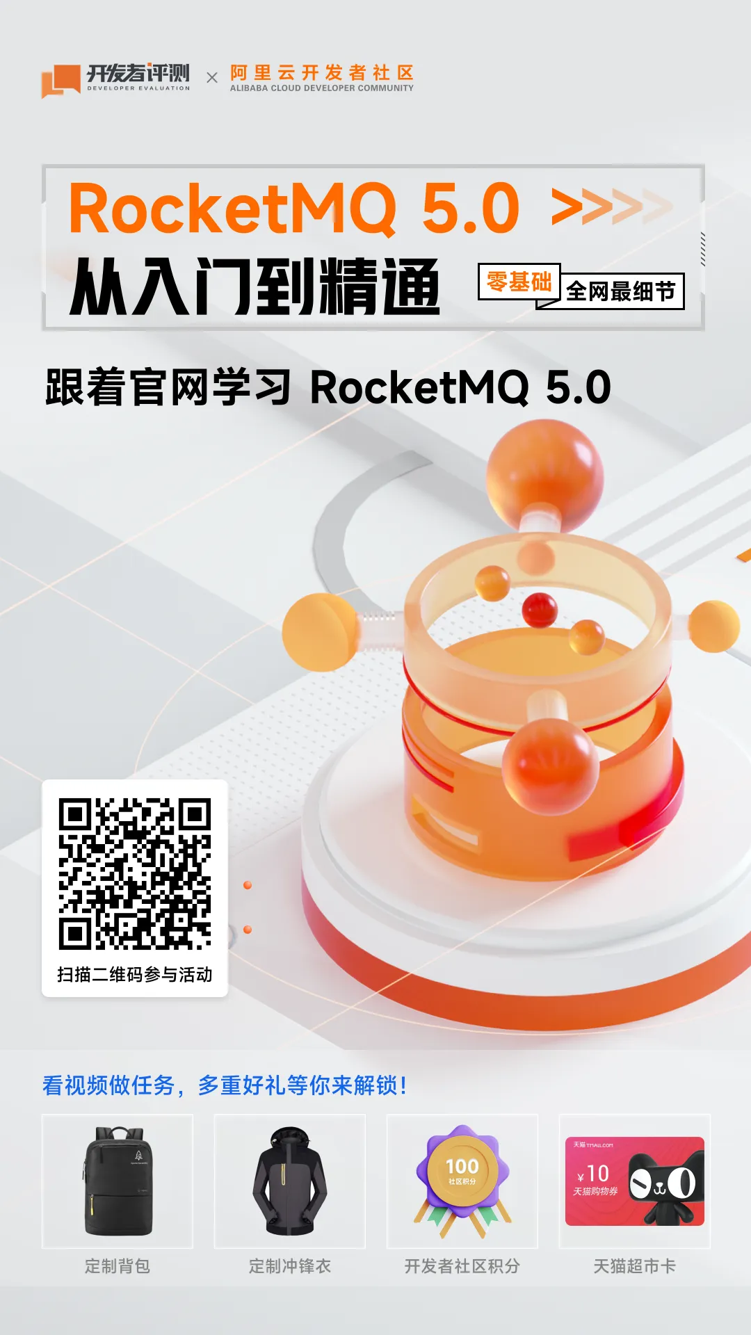 基于课程,也针对性打造了「RocketMQ 5.0 从入门到精通」活动,活动截止 10 月 31 日,参与活动,有机会获得阿里云社区定制周边!