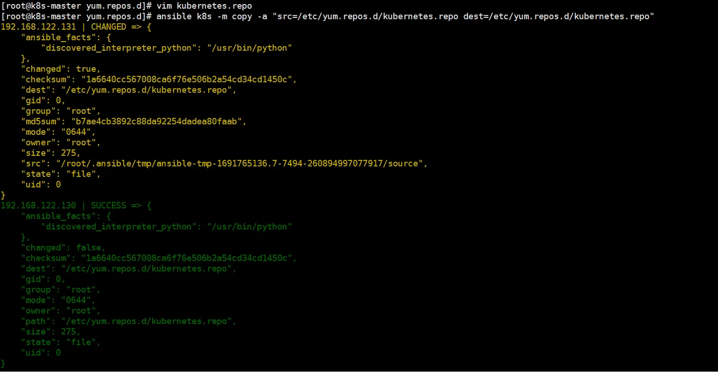 ansible k8s -m copy -a "src=/etc/yum.repos.d/kubernetes.repo dest=/etc/yum.repos.d/kubernetes.repo"