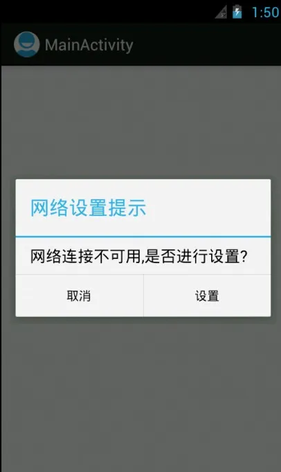 /* * 打开设置网络界面 * */ public static void setNetworkMethod(final Context context){ //提示对话框 AlertDialog.Builder builder=new Builder(context); builder.setTitle("网络设置提示").setMessage("网络连接不可用,是否进行设置?").setPositiveButton("设置", new DialogInterface.OnClickListener() { @Override public void onClick(DialogInterface dialog, int which) { // TODO Auto-generated method stub Intent intent=null; //判断手机系统的版本 即API大于10 就是3.0或以上版本 if(android.os.Build.VERSION.SDK_INT>10){ intent = new Intent(android.provider.Settings.ACTION_WIRELESS_SETTINGS); }else{ intent = new Intent(); ComponentName component = new ComponentName("com.android.settings","com.android.settings.WirelessSettings"); intent.setComponent(component); intent.setAction("android.intent.action.VIEW"); } context.startActivity(intent); } }).setNegativeButton("取消", new DialogInterface.OnClickListener() { @Override public void onClick(DialogInterface dialog, int which) { // TODO Auto-generated method stub dialog.dismiss(); } }).show(); }