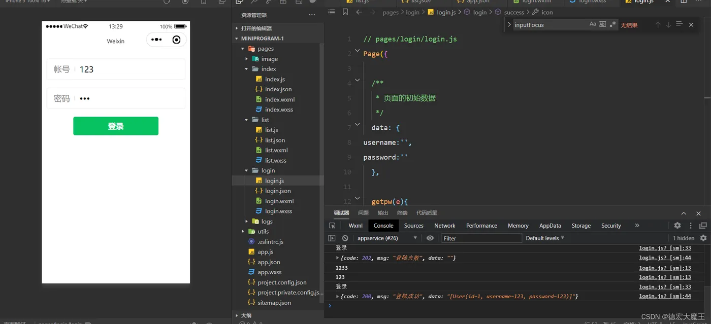 <form class="login-form"> <view class="input-group {{userid_focus ? 'active' : ''}}"> <text class="input-label">帐号</text> <input type="number" cursor-spacing="30" id="userid" maxlength="7" placeholder="请输入账号" bindinput="getusername"/> <view> <view class="input-group {{passwd_focus ? 'active' : ''}}"> <text class="input-label">密码</text> <input password="true" cursor-spacing="30" id="passwd" placeholder="输入密码"bindinput="getpw"/> <view> <button type="primary" bindtap="login">登录<button > </form>