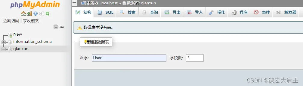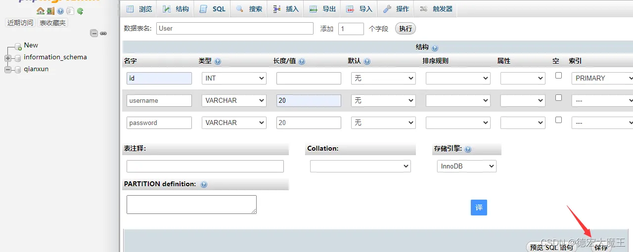 CREATE TABLE `qianxun`.`User` ( `id` INT NOT NULL AUTO_INCREMENT , `username` VARCHAR(20) NOT NULL , `password` VARCHAR(20) NOT NULL , PRIMARY KEY (`id`)) ENGINE = InnoDB;