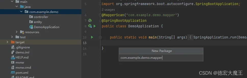 package com.example.demo; import org.mybatis.spring.annotation.MapperScan; import org.springframework.boot.SpringApplication; import org.springframework.boot.autoconfigure.SpringBootApplication; @MapperScan("com.example.demo.mapper") @SpringBootApplication public class DemoApplication { public static void main(String[] args) { SpringApplication.run(DemoApplication.class, args); } }
