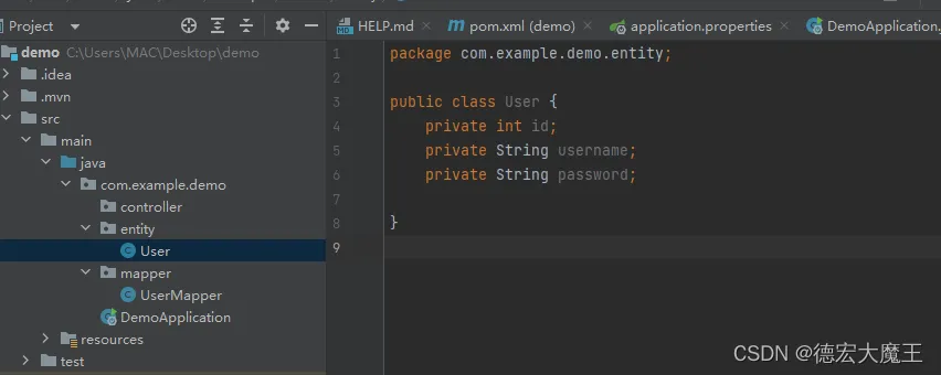 创建实体类,在entity文件夹下新建User.java完成字段映射,如下所示