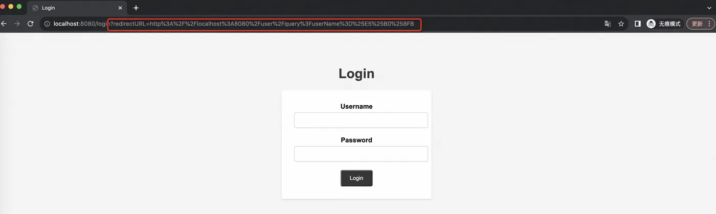 测试方法是打开一个无痕界面,随便输入一个链接:http://localhost:8080/user/query